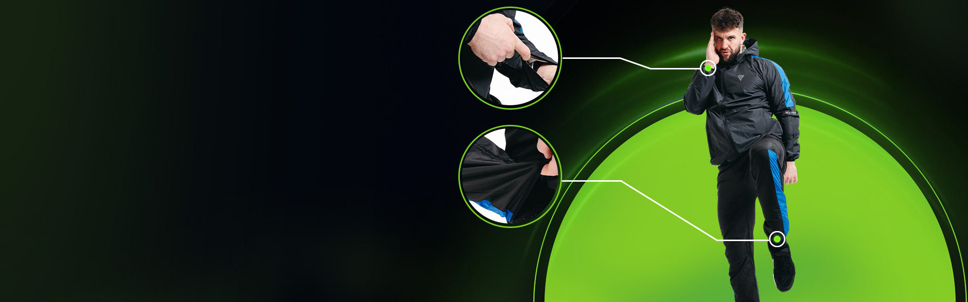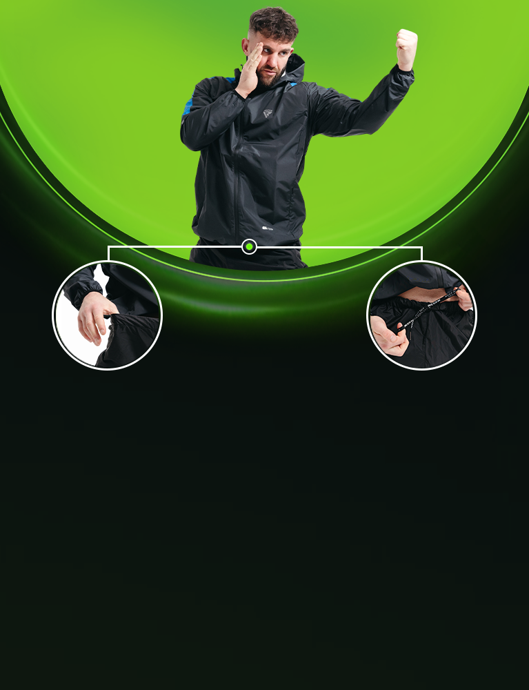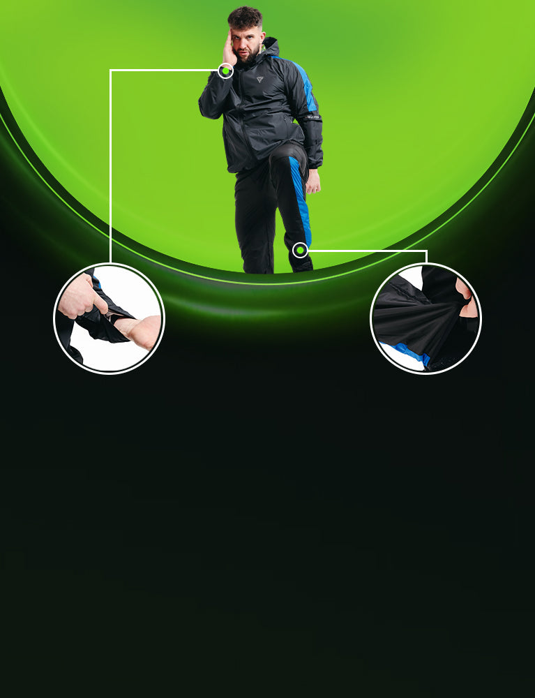 - Elastic cuffs and ankles trap heat, maximizing calorie burn and detoxification.