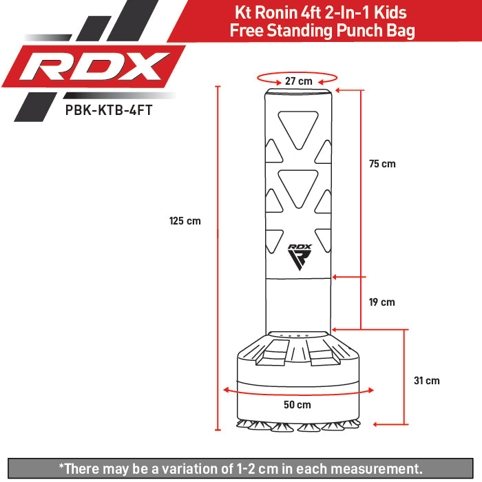 Have you ever wanted to give your child a chance to work out on an actual punch bag? Well, now there's no need to wait. The RDX KT Ronin Kids Free Standing Punch Bag is the perfect way for kids to get quality training. This bag is made of heavy-duty Maya hide NTearxand can surely take a beating! Plus, it's free-standing, so you don't need to think about finding a place to hang it. Give your children a chance to find their inner fighter and train like the pros with the RDX Ronin Junior free-standing punch bag.