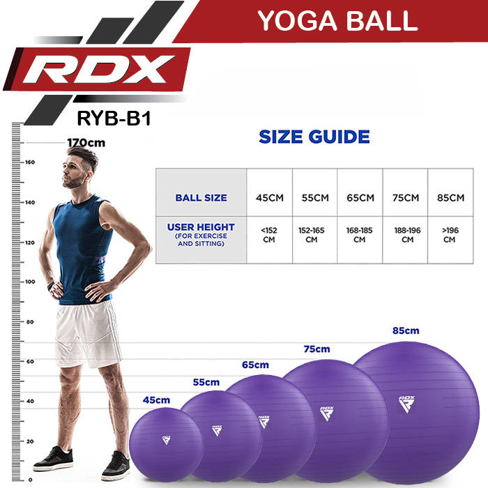 Wer sagt, dass Training langweilig sein muss? Bring deine Liebe zum Yogaball auf die Matte, um deine Routine aufzupeppen und noch mehr Vorteile des Yoga zu erleben. Der hochwertige, schadstofffreie, wasserdichte, langlebige und flexible RDX PVC Yogaball ist sicher Für den regelmŸigen Gebrauch und liefert eine hohe Kompression von bis zu 250kg. Habe SpaŸ beim Hpfen während der Aerobic-œbungen auf dem Anti-Burst-Design-Gymnastikball, der sicher und langsam die Luft ablsst, wenn er durchstochen wird, anstatt pltzlich in Fetzen zu platzen. Probiere aufregende Yoga-Posen aus, um verschiedene Muskeln auf eine neue Art und Weise zu trainieren. Aktiviere alle Muskeln in deinem ganzen Krper, indem du dehnst, balancierst, Bewegungen kontrollierst und Schmerzen oder Muskelkater aufgrund von Inaktivitt linderst. Entspanne deinen Rcken auf dem Stabilittsball zurck und entspanne dich während des Boot Stance. Arbeite daran, die neutrale Haltung der Wirbelsule zu verbessern, die Bauchmuskeln und den Kern zu strken. Ein Must-Have Yoga-Gert Für zu Hause kann auch als Bro-Ball-Stuhl verwendet werden, um die Taille zu stabilisieren oder als Schwangerschaftsball, um die Beschwerden von Schwangeren zu lindern. Erreiche all das und mehr mit einem einzigen, erschwinglichen und leichten Yoga- und Balance-Trainingsgert (mit einem Gewicht von nur 700 g). Tragbares Design Für den Innen- und AuŸenbereich und bequem zu verstauen, indem man Gas ablsst, zmmenfaltet und in einem Schrank verstaut. Die rutschfeste Oberflche und die symmetrischen 360° rutschfesten horizontalen Linien sorgen Für einen festen Halt und null Traktion, während du an der Verbesserung des Gleichgewichts und der Stabilitt während des BeckenstoŸes und verschiedener Beinbungen arbeitest.
