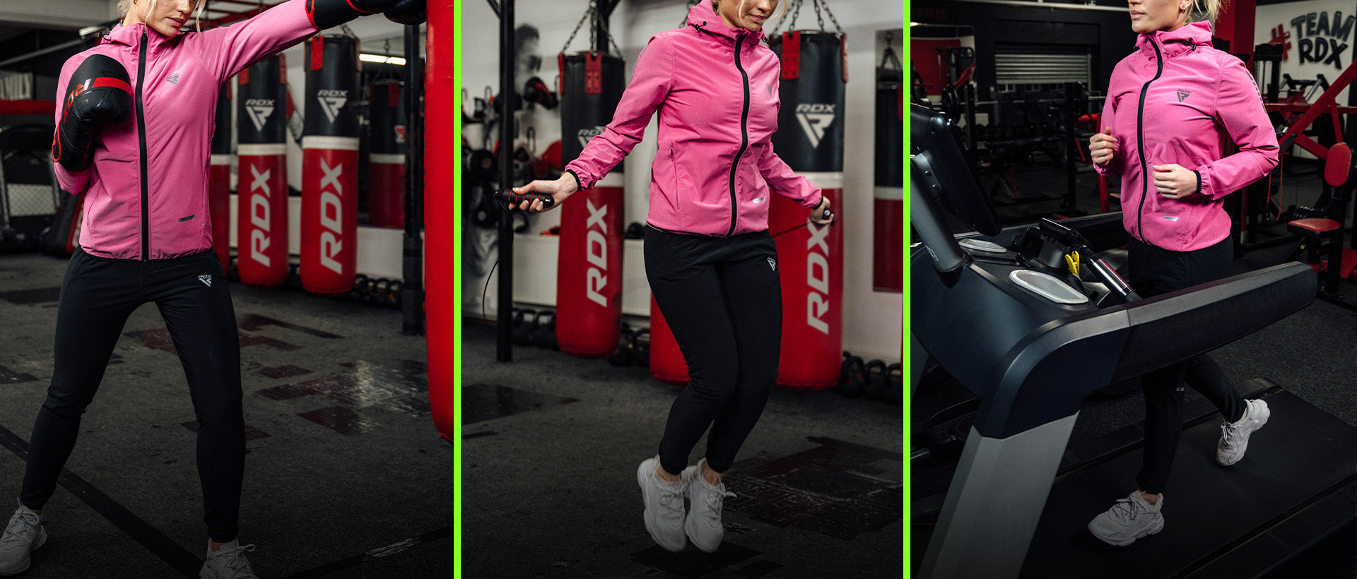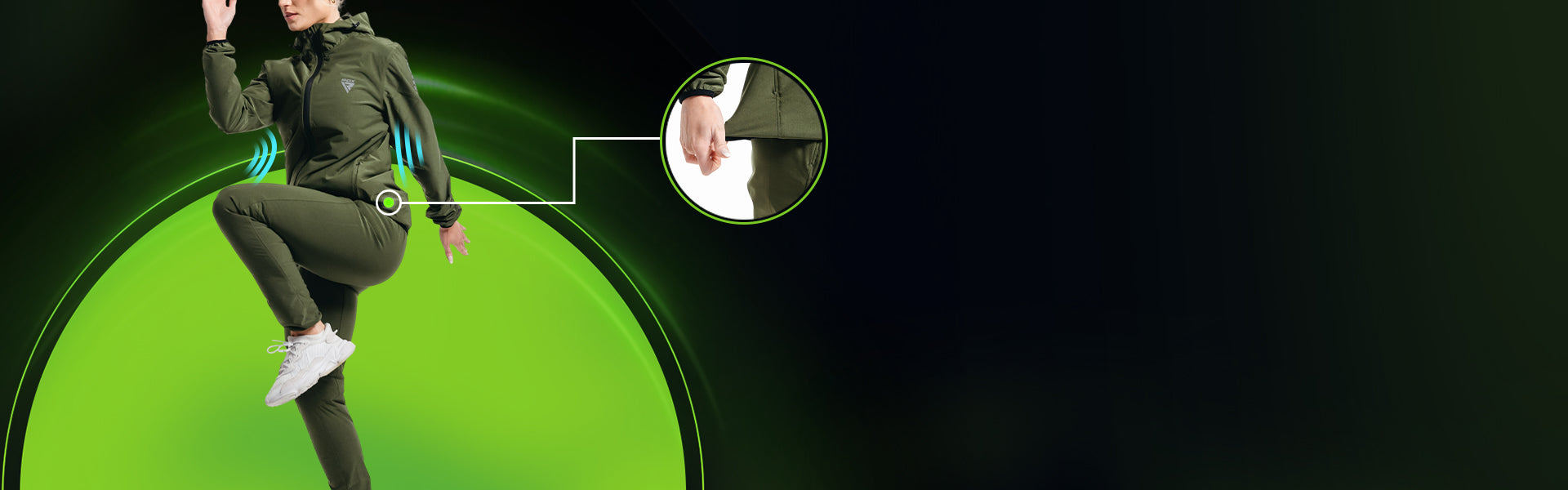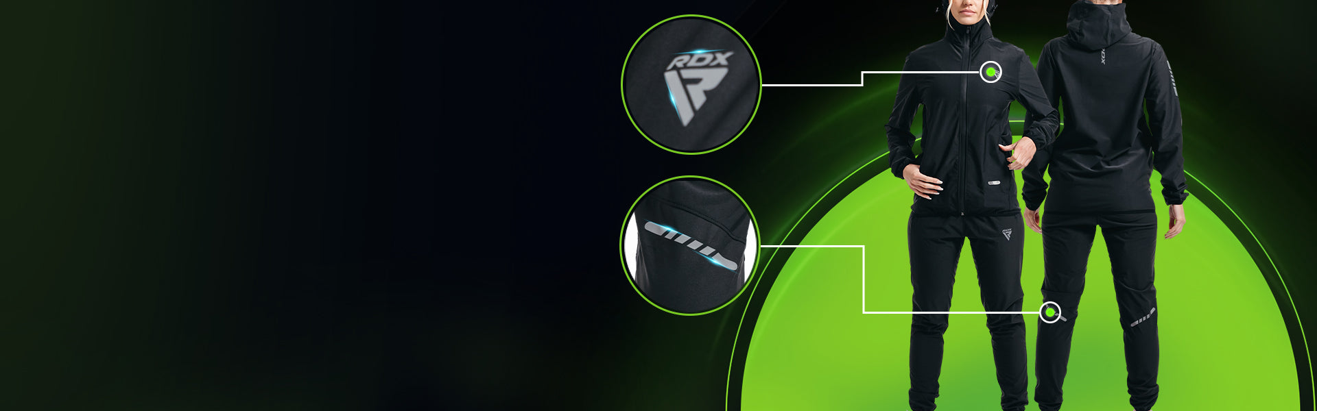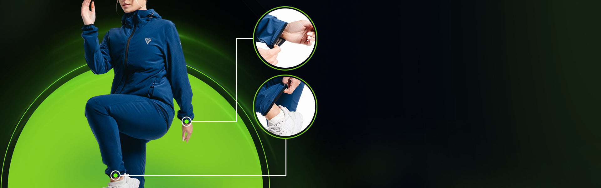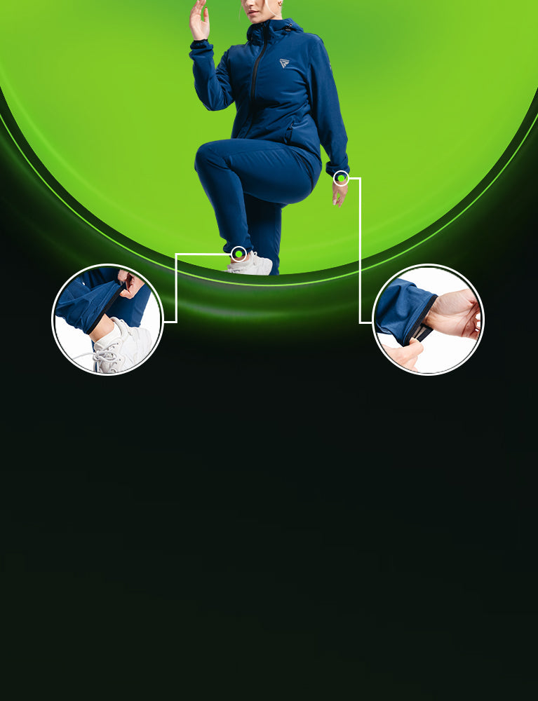 - Elastische Bndchen an den „rmeln und Kncheln halten die Wrme zurck und schaffen eine persnliche Sauna, die die Intensitt erhht.